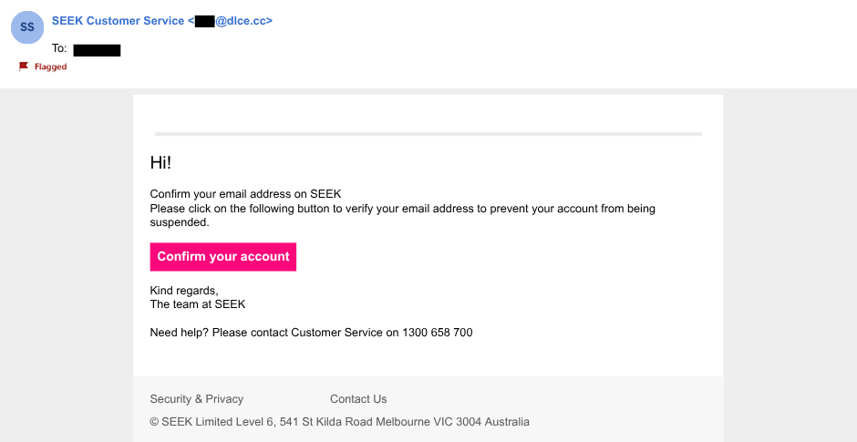 Summary: Scammers impersonate SEEK and send phishing emails that require employers to confirm their SEEK accounts to avoid suspension. The email does not provide any further explanation for the request. Scammers urge recipients to click a “Confirm your account” button, which redirects them to a phishing site designed to steal SEEK credentials.